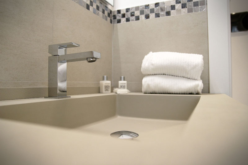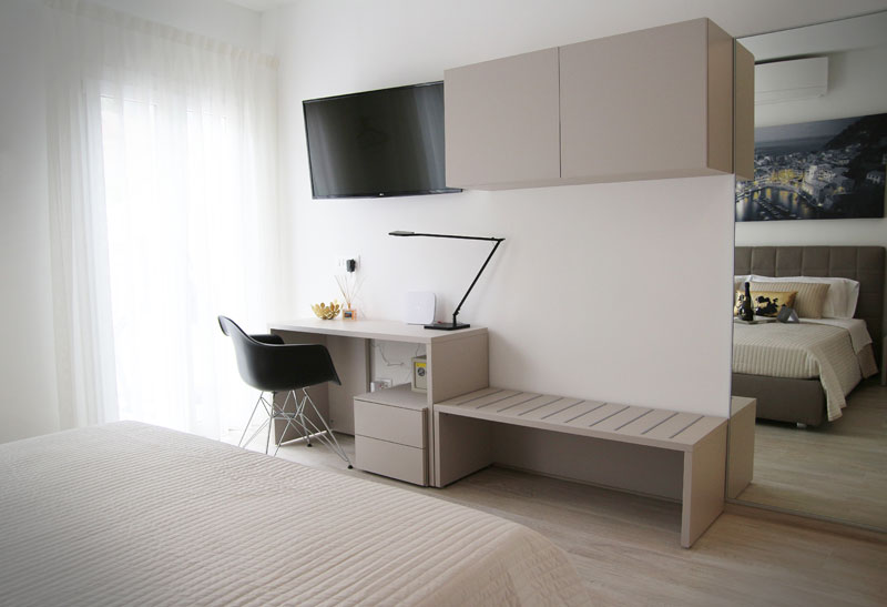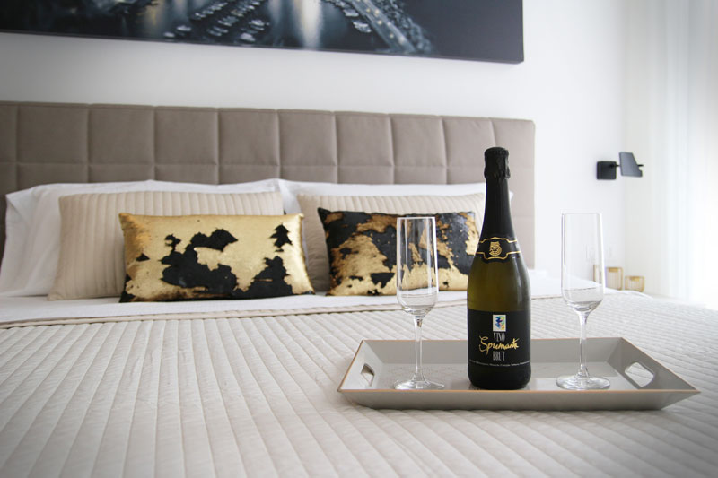 Tutte le camere sono personalizzate con arredi di design per garantire il massimo confort ai propri ospiti, i letti matrimoniali in tessuto sfoderabile coordinato con i colori delle tappezzerie.